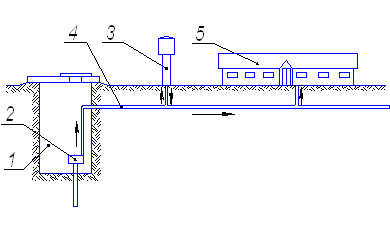 Рис. 1. Конструктивно-технологическая схема ПТЛ водоснабжения и автопоения: 1 – насосная станция; 2 – центробежный насос; 3 – водонапорная башня; 4 – водопроводная сеть; 5 – водопотребитель (поилки). 2.3 Определение производительности ПТЛ, подбор машин для выполнения технологических операций и определение их количества Расчет потребности в воде При определении потребности в воде необходимо знать среднесуточный расход воды всеми потребителями, который определяется по формуле: