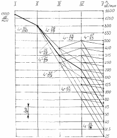 1.2 Построение графика частот вращения шпинделяИз структурной формулы z=3*3*2 видно, что число валов в коробке скоростей 5 (число сомножителей плюс один и плюс вал электродвигателя). Для построения графика на одинаковом расстоянии друг от друга проводим вертикальные линии, число которых равно числу валов в приводе. На расстоянии равном lgj проводим горизонтальные линии, число которых равно числу частот вращения шпинделя плюс 2-5. При построении графика следует учесть, что передаточные отношения понижающих передач не должны быть меньше ј, а повышающих не более 2. 1.3 Определение чисел зубьев шестерен