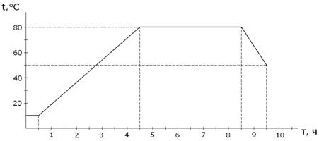 6. Режим тепловой обработки Для увеличения скорости нарастания структурной прочности цементнопесчаной черепицы применяется тепловлажностная обработка бетонных изделий. Для ускорения твердения бетона применяют различные тепловые установки, в них постепенно бетон нагревается за счёт отдачи теплоты пара, и с ростом температуры ускоряется реакция гидратации и структурообразования. Цикл тепловлажностной обработки бетонных изделий складывается из следующих периодов: 1) подъем температуры в камере до принятого наивысшего уровня; 2) изотермический прогрев изделий в камере при наивысшей принятой температуре; 3) охлаждение изделий.