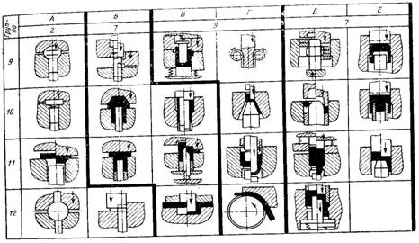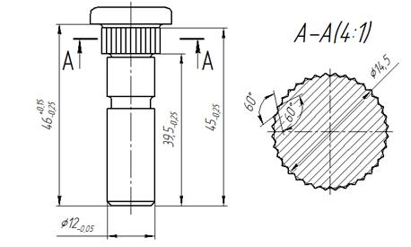 Рис. 1 Деталь «Палец» Исходя из формы детали, можно сделать вывод, что она применяется при необходимости соединения деталей из дерева, которые не подвергаются высоким нагрузкам, например в мебельной продукции и т.д. 2. Обзор способов холодной штамповки При холодной объемной штамповке (ХОШ) металл пластически деформируется в штампе в холодном состоянии. В качестве заготовок для ХОШ обычно применяют прутковый материал из углеродистых и легированных сталей с низким, средним и высоким сопротивлением деформированию, а также из цветных металлов и их сплавов[1]. В связи с тем, что при холодной объемной штамповке металл не нагревается, она имеет перед горячей ряд преимуществ: из-за отсутствия на поверхности деталей окалины и обезуглероженного слоя повышается точность их размеров и снижается шероховатость поверхности. Это позволяет свести к минимуму последующую обработку деталей резанием и соответственно расход металла. ХОШ в зависимости от формы деталей может осуществляться осадкой, высадкой, выдавливанием, калибровкой, чеканкой и применяется для изготовления болтов, винтов, заклепок, гаек, шариков, роликов, поршневых пальцев, мелких цилиндрических и конических зубчатых колес и т. д. Рабочие части инструмента-штампа для ХОШ работают в тяжелых условиях повышенного трения, высоких удельных усилий, достигающих 2000—2500 МПа, и высоких температур, развиваемых в процессе деформирования. В связи с этим для изготовления штампов применяют стали повышенной и высокой износостойкости, например Х6ВФ, 9Х5ВФ, X12, а также используют различные смазки и производят предварительную подготовку поверхности заготовок (нанесение веществ, уменьшающих трение), например, фосфатирование. К числу наиболее прогрессивных процессов, основанных на холодной пластической деформации, относятся взаимно дополняющие друг друга процессы листовой и холодной объемной штамповки. При холодной объемной штамповке достигается: деформационное упрочнение, отсутствие надрезов, направленность волокна вдоль конфигурации штампованной заготовки, увеличение коэффициента использования металла и т.д. В таблице 1 дается классификация процессов ХОШ [1]. Все операции в зависимости от характера преобладающего формоизменения разделены на 12 групп с индексами А, Б, В, Г, Д, Е, Ж, И, К, Л, М, Н, каждому из которых соответствует ряд с порядковым номером 1 – 12: А, Б, В – осадка, высадка, чеканка; Г, Д, Е – редуцирование, прямое выдавливание; Ж, И, К, Л, М, Н – выдавливание обратное, комбинированное, радиальное, вытяжка с утонением и др. Также в таблице 1 под соответствующим индексом введен показатель условной сложности наладки (1 – 9 в порядке повышения сложности). Операции с использованием инструмента примерно одинаковой сложности объединены, и границиы раздела выделены толстыми линиями. Анализируя таблицу 1, можно сделать вывод, что для изготовления детали «Палец» необходимо использовать оперцаии прямого выдавливания, высадки, накатки и нарезки резьбы. Таблица 1. Классификация операций холодной объемной штамповки