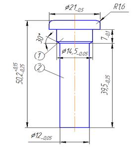 Рис. 5 Заготовка детали «Палец» 5.2 Структура технологического процесса Технологический процесс изготовления детали состоит из следующих операций: 1) контроль исходного материала; 2) очистка; 3) правка, калибровка по диаметру Ø14,5 мм; 4) нанесение канавок (рис. 4); 5) отрезка (рис. 5); 6) прямое выдавливание с высадкой головки (рис.7); 7) накатка (рис. 8); 8) прямое выдавливание рифленой поверхности (рис.10); 9) нарезание резьбы. Прямое выдавливание с высадкой головки Данная операция является комплексной, т.к. в данном случае на заготовке мы получаем головку и ступень во втрой части. Следовательно, расчет будет вестись поэтапно. Высадка головки осуществляется пуансоном в сомнкнутой неподвижной матрице. После соприкосновения пуансона с торцевой поверхностью матрицы, начнется процесс деформации металла с заполнением цилиндрической полости в пуансоне. Параллельно заготовка начнет поступательное движение в матрице и начнется прямое выдавливание, в результате которого диаметр поперечного сечения станет равен 12 мм [2]. Рассчитаем геометрические размеры заготовки после операции. 1) Условно разделим объем на две части. Объем 1 известен, т.к. в, результате выдавливания, верхняя часть заготовки будет такой, какой она должна быть по заданию (см. рис. 1):