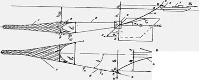 Рисунок 1. Траловая рыболовная система Траловая система предназначена для лова гидробионтов (рыб, кальмаров, креветок, криля) тралами. Трал - отцеживающее орудие промышленного рыболовства, представляющее собой сетную оболочку с системами остропки и оснастки, которые обеспечивают его прочность, горизонтальное и вертикальное раскрытия. Трал состоит из двух основных частей: передней - для концентрации и направления рыбы, и задней (мешка) - для отбора рыб промысловых размеров (селекции), их удержания и накопления . Различают донные и разноглубинные тралы. Донные используют для лова донных (камбалы, палтуса, ската) и придонных (трески, хека, угольной рыбы, морского окуня) рыб, ракообразных (креветок) и других, разноглубинные - для лова пелагических рыб и ракообразных (сельди, сардины, скумбрии, ставриды, минтая, тунца, мавроликуса, криля). В связи со значительной порчей донными тралами кормовой базы рыб (бентоса) в настоящее время они вытесняются универсальными тралами, позволяющими ловить донных, придонных и пелагических рыб и беспозвоночных. Эффективность лова рыбы тралами в основном определяется; скоростью траления У8, вертикальным Н;. и горизонтальным Ву раскрытиями устья трала, углом атаки сетной оболочки а n. Вертикальное раскрытие трала обеспечивается оснасткой его верхней и нижней подбор. Верхняя подборка оборудована шаровыми поплавками (кухтылями) или гидродинамическими щитками (ГДЩ) из жестких (пластмассы, дюралюминия) или гибких (брезента, прорезиненной ткани) материалов; нижняя - якорными цепями для разноглубинного трала или грунтропом для донного трала. Иногда нижнюю подбору донных тралов оснащают щитками из гибких материалов. Основные части трала и их назначение Трал состоит из сетной оболочки, ее остропки, оснастки подбор и кабелей. Сетная оболочка трала служит для отцеживания рыб из водной среды. Она состоит из крыльев, мотни, мешка (рис. 10). Крылья позволяют равномерно через подборы передавать нагрузку от мотни к кабелям, также выполняют залавливающие функции. Мотня служит для буксировки мешка, отпугивания рыб и направления их в мешок. При помощи мешка осуществляется отбор рыб промысловых размеров - селекция, их удержание и накопление. Остропка сетной оболочки включает систему канатов (верхнюю, нижнюю и боковые подборы, сборочные топенанты, пожилины), обеспечивающую общую прочность сетной оболочки. Остропка передает усилия от сетной оболочки на кабели. Кабели соединяют трал с траловыми досками. Их использование позволяет увеличить зону облова, так как траловые доски и кабели, отпугивая рыб, заставляют их перемещаться к оси трала, концентрироваться в его устье.