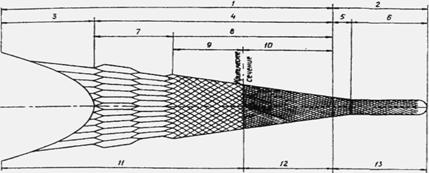Рис. 10. Сетная оболочка трала (СО): 1 - передняя часть СО; 2 - задняя часть СО (мешок); 3 - крылья: 4 - мотня; 5-коническая часть мешка; 6 - цилиндрическая часть мешка; 7 - канатная часть мотни; 8 - делевая часть мотни; 9 - крупноячейная часть мотни; 10 - мелкоячейная часть мотни; 11 - отпугивающая часть СО; 12 - направляющая часть СО; 13 - аккумулирующая улов часть СО Залавливающая зона - это часть пространства, ограниченная сетной оболочкой. Она делится на три подзоны: отпугивающую, направляющую и накапливающую улов. Главной функцией отпугивающей части является отпугивание гидробионтов от сетной оболочки трала. Эта подзона охватывает крылья, канатную и крупноячейную части мотни (а > 200 мм). Направляющая подзона - это область, ограниченная мелкоячейной частью мотни. Ее назначение - направить рыбу в мешок трала и не дать ей возможности выйти через ячею оболочки. Границей этих двух подзон является критическое сечение трала. За ним характер поведения рыбы качественно меняется, так как она воспринимает трал как опасность и пытается выйти из него. Это объясняется достижением в этом сечении критической концентрации рыб рсф и подходом их к сетной оболочке ближе, чем на дистанцию реагирования на сетное полотно Вгн. Положение критического сечения зависит от скорости траления, плотности и размеров облавливаемых стай. При проектировании тралов критическое сечение фиксируется тем, что перед ним сетная оболочка трала выполняется из канатов и крупноячейной дели, за ним - из мелкоячейной дели. Зимой треска может иногда выходить на меньшие глубины, встречаясь в уловах вентерей, выставляемых в Амурском заливе на навагу. Вентери относятся к стационарным орудиям рыболовства - ловушкам закрытого типа. Вентери состоят из трех конструктивных элементов: направляющего устройства, ловушки, кутка. Направляющее устройство состоит из сетного крыла и открылков (рис. 2). Ловушка представляет собой объемную сетную конструкцию, внутри которой ставятся входные устройства - усынки в виде усеченного конуса. Как правило, количество усынков в вентере составляет 2-3. По конструкции ловушки вентери подразделяются на два типа: кательные и бескательные. Кательные представляют собой сетной цилиндр-бочку, который монтируется на кателях - деревянных обручах. У бескательных вентерей каркас ловушки делается из канатов и имеет прямоугольную форму. Кутки для концентрации улова представляют собой цилиндрические или конические мешки. На Дальнем Востоке наибольшее распространение получили вентери кательного типа. Размеры крыльев и ловушек вентерей определяются условиями лова. В вентерях диаметр первого обруча принимается в пределах 1,5-3 м. Размер последующих обручей к кутку постепенно уменьшают, так чтобы они входили один в другой. Это делается для удобства транспортировки и работы с вентерями. Количество обручей в ловушке обычно не превышает 6-7, а расстояние между ними составляет от 0,5 до 0,75 диаметра обруча. В ряде случаев вход в ловушку делают прямоугольным, заменяя первый обруч рамой. Длина усынков должна равняться расстоянию между обручами или несколько превышать его. Широкой кромкой усынок прикрепляется к переднему обручу. Периметр входного отверстия в посадке принимается в пределах 0,2-0,7 длины окружности обруча. Оно расправляется специальными нитями-симками, которые завязываются