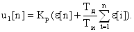 где: u1(t) – регулирующее воздействие на объект; e(t) – сигнал ошибки, e(t) = g(t) – y(t); Кр и Ти – параметры настройки непрерывного ПИ-регулятора. Замена непрерывных сигналов цифровыми, взятыми в дискретные моменты, может быть проведена по следующей схеме: e(t) ® e[n]; u1(t) ® u1[n]; Здесь и ниже для удобства записи принимаем: u[nT0]=u[n]; ПИ-закон регулирования в цифровой форме имеет вид: