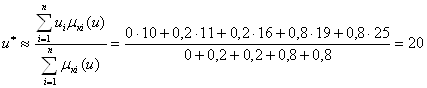 Рис. 7. Структурная схема САУ с Fuzzy-компенсатором Fuzzy-компенсатор содержит три основных блока: F – блок фаззификации БФ, I – блок нечеткого вывода БНВ (блок принятия решений), D – блок дефаззификации БДФ. Вся информация о стратегии управления заложена в базе знаний в виде правил условного логического вывода: Если…. тогда… Эти правила получаются за счет тщательного изучения ОУ и цели его управления путем анкетного опроса экспертов (технологи-операторы, специалисты по автоматизации). Центральным звеном является БНВ, в котором нечеткая информация о возмущении f (его производной) формирует нечеткое множество управления. Выполняется инференц-процедура, в результате которой объединяются выводы нечетких правил, и результатом этого объединения является усеченное множество управляющих воздействий. БФ преобразует конкретное измеренное значение возмущения с помощью некоторой функции принадлежности в нечеткое множество. В БДФ происходит обратный процесс. 9.2 Расчёт управляющего воздействия нечёткого компенсатораНеобходимо рассчитать компенсирующее воздействие нечёткого компенсатора u2 для случая, когда |f| = 0,2 и |f’| = 0,1. Упрощённый алгоритм нечёткого управления представлен следующими двумя правилами: Правило №1: Если |f| = ПБ ИЛИ |f’| = ПН, тогда Uк = ПБ; Правило №2: Если |f| = ОБ И |f’| = ПН, тогда Uк = ПН. Fuzzy-логика осуществляется в 3 этапа: I этап – фаззификация. Фаззификация осуществляет переход от четких измеренных значений f и f’ к нечеткому множеству значений входа. Этот переход осуществляется с помощью функций принадлежности. Каждому значению f ставится в соответствие определенное значение функции принадлежности. После этого начинается II этап – разработке нечетких правил. Вычисление этих правил состоит из двух процедур: сначала рассчитывается все в части Если, а потом в части Тогда. Посылка «ЕСЛИ», первого правила, содержащая внутри себя союз «ИЛИ» даёт значение функции принадлежности m1 (f1, f2), соответствующее логической конъюнкции: m1 (f, f’) = max{mПБ(f), mПН(f’)} = max {0,4; 0,8} = 0,8; m2 (f, f) = min{mОБ(f), mПН(f’)} = min {0,4; 0,2} = 0,2. Теперь в соответствии с композиционным правилом Мамдани: mjn (x, uj) = min{mj(x), m1(uj)} (6.1) где mjn (x, uj) – ФП, характеризующая i – лингвистическое значение управляющего воздействия u в j – правиле; x – вектор входных переменных. Можно определить результирующие функции принадлежности, характеризующие импликации правил 1 и 2 (приложение 5.), где miU2 – функции принадлежности, характеризующие фаззи-множества управляющих воздействий u. Так как функции m1,2 (f1, f2) принимают конкретные значения, меньшие единицы, то результатам импликации соответствуют «усечённые» функции принадлежности miU2 (приложение5). Выполняя процедуру фаззи-объединения функций miU2 (агрегирование) получаем результирующую функцию принадлежности m*(U2) (приложение 5). Заключительным этапом Fuzzy-логики является дефаззификация, которая сводится к определению точного значения управляющего воздействия u по нечеткому множеству. Она выполняется чаще всего по методу центра тяжести, согласно которому для непрерывной функции искомое значение управляющего воздействия определяется как абсцисса центра тяжести площади фигуры, образованной этой функцией и осью u.