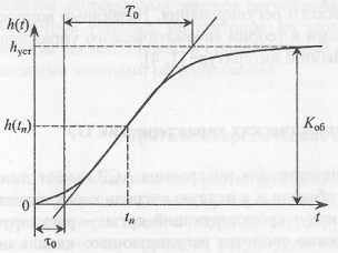 Для определения параметров объекта по управляющему каналу проведём касательную к экспериментальной переходной характеристике в точке перегиба, которая имеет координатами (tп; h(tп)). Далее определяем параметры передаточной функции по управляющему каналу (приложение 1): Коб = hуст = 0,55; tо = 1,9с; То = 10,5с; h(tп) = 0,12; tп = 4с