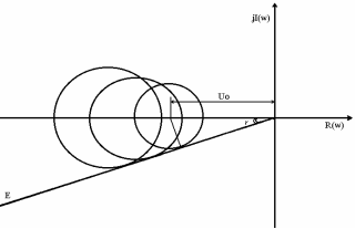 где: wр – резонансная частота, на которой Аз() имеет максимум. Чтобы максимум не превышал некоторой заданной величины М, амплитудно-фазовая характеристика (АФХ) разомкнутой системы Wраз(j) не должна заходить внутрь «запретной» области ограниченной окружностью, центр uo и радиус Ro которой определяется через М формулами (2.3) и (2.4), (рис. 4):