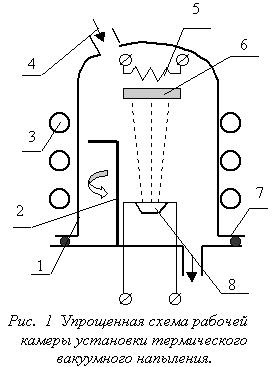 Основными элементами установки вакуумного напыления, упрощенная схема которой представлена на рис.1, являются: 1 - вакуумный колпак из нержавеющей стали; 2 - заслонка; 3 - трубопровод для водяного нагрева или охлаждения колпака; 4 - игольчатый натекатель для подачи атмосферного воздуха в камеру; 5 - нагреватель подложки; 6 - подложкодержатель с подложкой, на которой может быть размещен трафарет; 7 - герметизирующая прокладка из вакуумной резины; 8 - испаритель с размещённым в нём веществом и нагревателем (резистивным или электронно-лучевым). Процесс проведения операции вакуумного напыления включает в себя выполнение следующих действий. В верхнем положении колпака с подложкодержателя снимают обработанные подложки и устанавливают новые. Колпак опускают и включают систему вакуумных насосов (вначале для предварительного разрежения, затем высоковакуумный). Для ускорения десорбции воздуха с внутренних поверхностей и сокращения времени откачки в трубопровод подают горячую проточную воду. По достижении давления внутри камеры порядка 10-4 Па (контроль по манометру) включают нагреватели испарителя и подложек. По достижении рабочих температур (контроль с помощью термопар) заслонку отводят в сторону и пары вещества достигают подложки, где происходит их конденсация и рост плёнки. Система автоматического контроля за ростом плёнки фиксирует либо толщину плёнки (для диэлектрика плёночных конденсаторов), либо поверхностное сопротивление (для резисторов), либо время напыления (проводники и контакты, защитные покрытия). Вырабатываемый при этом сигнал об окончании напыления после усиления воздействует на соленоид заслонки, перекрывая ею поток пара. Далее отключают нагреватели испарителя и подложек, выключают систему откачки, а в трубопровод подают холодную проточную воду. После остывания подколпачных устройств через натекатель плавно впускают атмосферный воздух. Выравнивание давлений внутри и вне колпака даёт возможность поднять его и начать следующий цикл обработки. Процесс термического вакуумного напыления характеризуется температурой на испарителе t°ис, давлением воздуха в рабочей камере P0, температурой нагрева подложек t°п. Температура нагрева вещества в испарителе (t°ис) должна обеспечивать достаточно высокую интенсивность испарения, чтобы время напыления пленки не превышало 1-2 минут. В то же время чрезмерно высокая интенсивность приводит к образованию мелкозернистой неустойчивой структуры в плёнке, о чём будет сказано ниже. Интенсивность испарения удобно характеризовать упругостью пара (давлением пара в состоянии насыщения) PS. Упругость пара для данного вещества зависит только от температуры