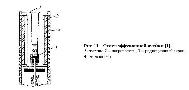 Испарение материалов, осаждаемых в сверхвысоком вакууме на подложку, закрепленную на манипуляторе с нагревательным устройством, осуществляется с помощью эффузионных ячеек (эффузия – медленное истечение газов через малые отверстия). Схема эффузионной ячейки приведена на рис.11. Эффузионная ячейка представляет цилиндрический стакан, выполненный из пиролитического нитрида бора или высокочистого графита. Поверх тигля располагаются, нагревательная спираль из танталовой проволоки и тепловой экран, изготовленный обычно из танталовой фольги. Эффузионные ячейки могут работать в области температур до 1400 0С и выдерживать кратковременный нагрев до 1600 0С. Для испарения тугоплавких материалов, которые используются в технологии тонких магнитных пленок и многослойных структур, нагревание испаряемого материала осуществляется электронной бомбардировкой. Температура испаряемого вещества контролируется вольфрам-рениевой термопарой, прижатой к тиглю. Испаритель крепится на отдельном фланце, на котором имеются электрические выводы для питания нагревателя и термопары. Как правило, в одной ростовой камере располагается несколько испарителей, в каждом из которых размещены основные компоненты пленок и материалы легирующих примесей.
