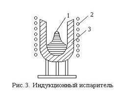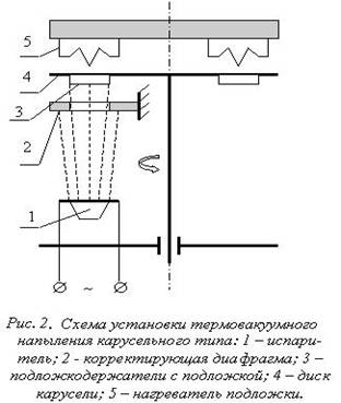 С учётом изложенного производственные установки термовакуумного напыления снабжены вращающимися устройствами (дисками, барабана-ми), несущими несколько подложек (6, 8 или 12). Подложки последовательно и многократно проходят над неподвижным испарителем (рис.2), постепенно набирая необходимую толщину плёнки. В результате центральный "холм", который мог бы образоваться, на неподвижной подложке, размывается в хребет, вытянутый в направлении движения подложки. Для выравнивания толщины плёнки в поперечном направлении применяют корректирующую диафрагму, устанавливаемую между испарителем и подложкой в непосредственной близости от нее. Профиль диафрагмы рассчитывается на основании исследования рельефов плёнки, получаемых при напылении на неподвижную и движущуюся подложки. В результате различия времени облучения центральной и периферийной зон подложки равномерность толщины плёнки на всей площади групповой подложки повышается и находится в пределах ±2% (для подложек 60х48 мм). Основными достоинствами этого метода генерации являются: - возможность нанесения пленок металлов (в том числе тугоплавких), сплавов, полупроводниковых соединений и диэлектрических пленок; - простота реализации; - высокая скорость испарения веществ и возможность регулирования ее в широких пределах за счет изменения подводимой к испарителю мощности; - стерильность процесса, позволяющая при наличии высокого (а при необходимости сверхвысокого) вакуума получать покрытия практически свободные от загрязнений. Все испарители различаются между собой по способу нагрева испаряемого вещества. По этому признаку способы нагрева классифицируются следующим образом: резистивный, индукционный, электронно-лучевой, лазерный и электродуговой. 1.1 Резистивное напылениеЭто первый метод нанесения тонкопленочных покрытий в вакууме, который до недавнего времени наиболее широко применялся. Отличительными особенностями его являются техническая простота, удобство контроля и регулирования режимов работы испарителя и возможность получения покрытий различного химического состава. В резистивных испарителях тепловая энергия для нагрева испаряемого вещества образуется за счет выделения джоулева тепла прохождении электрического тока через нагреватель. К материалам, используемым для изготовления нагревателей резистивных испарителей, предъявляются следующие требования. 1. Давление пара материала нагревателя при температуре испарения осаждаемого вещества должно быть пренебрежительно малым. 2. Материал нагревателя должен хорошо смачиваться расплавленным испаряемым веществом, так как это необходимо для обеспечения хорошего теплового контакта между ними. 3. Между материалом нагревателя и испаряемым веществом не должны возникать никакие химические реакции и образовываться легколетучие сплавы этих веществ, так как в противном случае происходит загрязнение наносимых пленок и разрушение нагревателей. Для нанесения покрытий резистивным методом применяются различные конструкции и способы испарения металлов и сплавов. Наиболее широко используются проволочные, ленточные, тигельные и автотигельные испарители дискретного действия. Проволочные испарители, основное достоинство которых заключается в простоте устройства и высокой экономичности, изготавливаются из пр