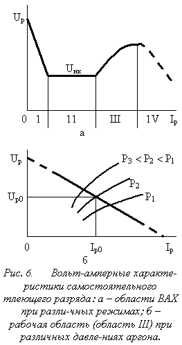 Режимы катодного распыления. На рис.6а приведена вольтамперная характеристика разряда. При подаче постоянного напряжения в несколько киловольт происходит пробой межэлектродного промежутка, быстрое нарастание тока и падение напряжения в разряде (область зажигания разряда I). При увеличении тока разряда за счёт уменьшения сопротивления Rн площадь катода-мишени, покрытая разрядом, возрастает, плотность разрядного тока и напряжение на разряде остаются постоянными и невысокими, а скорость распыления мала (область нормально тлеющего разряда II). В области III вся площадь мишени покрыта разрядом, и увеличение разрядного тока приводит к повышению плотности разрядного тока, напряжения на разряде и скорости распыления. Область Ш, называемая областью аномально тлеющего разряда, используется в качестве рабочей области в процессах катодного распыления. Для предотвращения перехода в область дугового разряда (область IV) предусмотрены интенсивное водяное охлаждение мишени и ограничение источника питания по мощности. На рис. 6,б выделена рабочая область III ВАХ. Крутизна характеристики в этой области зависит от давления рабочего газа, в нашем случае аргона. Рабочая точка, характеризующая режимы обработки - давление газа Р, ток Jp и напряжение Up разряда, лежит на нагрузочной характеристике источника питания