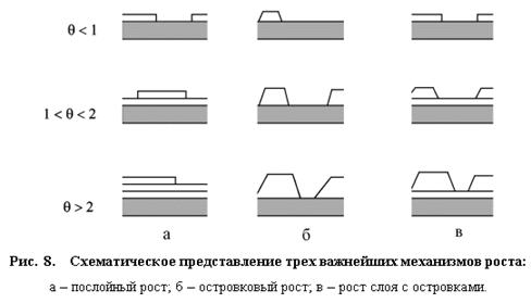 где Ed – энергия активации процесса десорбции, Ts– температура подложки. На феноменологическом уровне различают три основные типа роста тонких эпитаксиальных пленок: 1. Послойный рост (layer-by-layer growth). При этом механизме роста каждый последующий слой пленки начинает формироваться только после полного завершения роста предыдущего слоя. Этот механизм роста называют также ростом Франка-ван дер Мерве (Frank-van der Merve, FM). Послойный рост имеет место, когда взаимодействие между подложкой и слоем атомов значительно больше, чем между ближайшими атомами в слое. Схематическое представление послойного роста пленки для различной степени покрытия (в долях монослоев ML) показано на рис. 8,а.