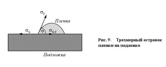 Из условия равновесия для любого элемента длины линии соприкосновения подложки, трехмерного островка пленки и вакуума (рис. 9.) получим