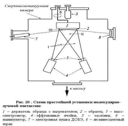Для более полного вывода условий, при которых реализуется тот или иной механизм роста, необходимо учесть влияние на условие равновесия между формируемой пленкой и подложкой газовой фазы в области роста пленки. Часто в литературе рассматривают еще один механизм роста – статистическое осаждение. При этом механизме роста пленки атомы осаждаемого вещества располагаются на поверхности согласно распределению Пуассона так, как если бы их бросали случайно и они просто прилипали бы на месте падения. 3.2 Молекулярно-лучевая эпитаксияМолекулярно-лучевая эпитаксия (МЛЭ) по существу является развитием до совершенства технологии вакуумного напыления тонких пленок. Ее отличие от классической технологии вакуумного напыления связано с более высоким уровнем контроля технологического процесса. В методе МЛЭ тонкие монокристаллические слои формируются на нагретой монокристаллической подложке за счет реакций между молекулярными или атомными пучками и поверхностью подложки. Высокая температура подложки способствует миграции атомов по поверхности, в результате которой атомы занимают строго определенные положения. Этим определяется ориентированный рост кристалла формируемой пленки на монокристаллической подложке. Успех процесса эпитаксии зависит от соотношения между параметрами решетки пленки и подложки, правильно выбранных соотношений между интенсивностями падающих пучков и температуры подложки. Когда монокристаллическая пленка растет на подложке, отличающейся от материала пленки, и не вступает с ним в химическое взаимодействие, то такой процесс называется гетероэпитаксией. Когда подложка и пленка по химическому составу не отличаются или незначительно отличаются друг от друга, то процесс называется гомоэпитаксией или автоэпитаксией. Ориентированное наращивание слоев пленки, которая вступает в химическое взаимодействие с веществом подложки, называют хемоэпитаксией. Граница раздела между пленкой и подложкой имеет ту же кристаллическую структуру, что и подложка, но отличается по составу, как от материала пленки, так и материала подложки. По сравнению с другими технологиями, используемых для выращивания тонких пленок и многослойных структур МЛЭ характеризуется, прежде всего, малой скоростью роста и относительно низкой температурой роста. К достоинствам этого метода следует отнести возможность резкого прерывания и последующего возобновления поступления на поверхность подложки молекулярных пучков различных материалов, что наиболее важно для формирования многослойных структур с резкими границами между слоями. Получению совершенных эпитаксиальных структур способствует и возможность анализа структуры, состава и морфологии растущих слоев в процессе их формирования методом дифракции отраженных быстрых электронов (ДОБЭ) и электронной оже-спектроскопии (ЭОС). Ниже на рис.10. показана упрощенная схема ростовой камеры МЛЭ.