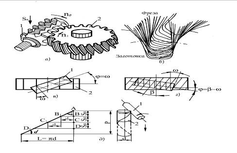 подачи, на которую возможна настройка станка, и числа зубьев колес Содержание отчета: 1. Наименование, цель и задачи работы. 2. Эскизы. 3. Результаты расчета занести бланк. 4. Выводы о проведенной работе. Общие сведения о станке: 1. Процесс нарезания зубчатых колес червячной фрезой Зубофрезерный станок мод. 5Д32 предназначен для нарезания цилиндрических прямозубых и косозубых зубчатых колес. Кроме того, на нем можно нарезать прямобочные и треугольные шлицы на валах, зубья звездочек цепных передач и т.п. Однако из-за низкой частоты вращения стола нарезание шлицев на зубофрезерных станках непроизводительно. На станке нарезают зубья червячных колес. При обработке червячной фрезой прямозубого или косозубого колеса воспроизводится зацепление червяка и зубчатого колеса: червяк имитируется режущим инструментом – червячной фрезой, а зубчатое колесо – заготовкой. Червячная фреза 1 (рис. 1,а) получает главное вращательное движение резания nф, и движение подачи Sв, а заготовка 2 – вращение nз, согласованное с вращением червячной фрезы. Благодаря вращательным движениям фрезы и заготовки, режущие кромки фрезы занимают множество положений и эвольвентные профили зубьев обрабатываемого колеса образуются как огибающие положений режущих кромок фрезы (рис.1,б). Этот метод обработки зубчатых колес, называемый методом обкатки, позволяет одним инструментом обрабатывать зубчатые колеса одного и того же модуля с разным числом зубьев. При обработке цилиндрических прямозубых колес (рис.1,в) между осью червячной фрезы 1 и торцовой плоскостью обрабатываемого колеса 2 устанавливают угол φ, равный углу подъема ω винтовой линии фрезы. При фрезеровании цилиндрических косозубых колес с углом наклона зуба β (рис.1,г) ось фрезы устанавливают под углом φ=β±ω (со знаком «плюс» - в случае разноименных направлений винтовых канавок на фрезе и заготовке, со знаком «минус» - при одноименных). Установка оси червячной фрезы под углом φ необходима для получения правильного профиля зубьев нарезаемого колеса в их нормальном сечении. Требуемый угол наклона линии зуба β обрабатываемого колеса обеспечивается тем, что заготовке в процессе нарезания сообщается дополнительное вращение по отношению к требуемому для обработки. На рис.1,д показаны делительный цилиндр заготовки такой высоты, что на
