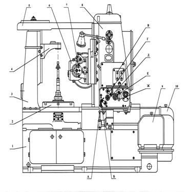 Рис. 1. Схемы нарезания цилиндрических зубчатых колес червячной фрезой 2. Техническая характеристика станка Пределы модулей зубчатых колес, мм по стали ……………………………………………………………2–6 по чугуну ………………………………………………………….2–8 Наибольший диаметр нарезаемых колес, мм ………………….800 Наибольшая ширина обработки, мм …………………………...275 Набольший диаметр фрезы, мм ………………………………...120 Угол поворота суппорта фрезы, град ………………………….±60 Пределы частот вращения шпинделя, мин–1 ……………….…47,5-192 Пределы вертикальных подач, мм/об ………………………..0,5-3 Пределы радиальных подач, мм/об …………………………..0,1-1 Мощность главного электродвигателя, кВт ……………………2,8 Масса станка, кг .……………………………………………….3650 3. Основные узлы станка и органы управления (рис.2). 1–станина; 2–стол; 3–стойка; 4–поддерживающий кронштейн; 5–поперечина; 6–фрезерный суппорт; 7–протяжной суппорт; 8–подвижная стойка; 9–гитары дифференциала и подач; 10–гитара деления и обкатки. А–рукоятка включения и выключения рабочих подач; Б-рукоятка включения подачи при работе с протяжным суппортом; В–кнопочная станция; Г-рукоятка включения вертикальной подачи фрезерного суппорта; Д–квадрат для ручного вертикального перемещения подвижной стойки; Е–квадрат для ручного горизонтального перемещения подвижной стойки; Ж-рукоятка включения радиальной подачи подвижной стойки.