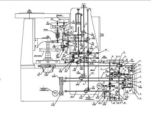 Рис. 2. Общий вид зубофрезерного полуавтомата модели 5Д32 металлорежущий педагогический зубофрезерный студенческий 4. Принцип работы Станок работает по полуавтоматическому циклу методом обкатки. Червячная фреза соответствующего модуля и диаметра закрепляется на оправке в шпинделе фрезерного суппорта 6 (рис. 2). Заготовка или комплект одновременно обрабатываемых заготовок устанавливается на оправке в шпинделе стола, а при больших размерах – непосредственно на столе 2. Червячной фрезе и заготовке принудительно сообщают вращательные движения с такими угловыми скоростями, которые они имели бы, находясь в действительном зацеплении. Нарезание цилиндрических колес производится с вертикальной подачей суппорта 6. Для обеспечения возможности фрезерования колес попутным методом на станке предусмотрено нагрузочное гидравлическое устройство, которое состоит из неподвижного штока с поршнем и цилиндра, связанного с салазками фрезерного суппорта (рис. 3). При фрезеровании попутным способом масло подводится в верхнюю полость цилиндра противовеса и поджимает противовес вместе с фрезерным суппортом вверх, устраняя возможность произвольного перемещения фрезерной бабки под действием усилия в пределах зазора между резьбой винта вертикальной подачи и маточной гайки. Методика измерений: При нарезании прямозубого цилиндрического колеса используются три формообразующих движения: 1) главное движение (вращение шпинделя фрезерного суппорта с червячной фрезой); вертикальная подача (вертикальное перемещение фрезы); 2) движение обкатки и деления (непрерывное, взаимосвязанное вращение стола с заготовкой); 3) движение обкатки и деления (непрерывное, взаимосвязанное вращение стола с заготовкой). При нарезании косозубого цилиндрического колеса, кроме трех вышеперечисленных движений, используется ещё одно - дополнительное вращение заготовки (цепь дифференциала). Настройка главного движения Кинематическая цепь главного движения является внешней цепью и обеспечивает вращение фрезы с заданной скоростью резания. Фреза получает вращение от электродвигателя мощностью 2,8 кВт с частотой вращения 1420 мин-1. Для обеспечения равномерности вращения фрезы на валу ХII установлен маховик (рис. 3). Уравнение кинематического баланса имеет вид