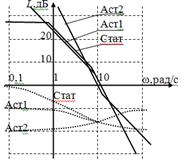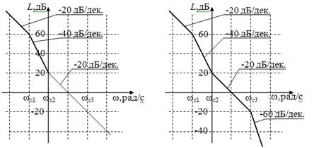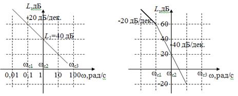 Рис. 5. ЛАХ с таким наклоном проводим до следующей сопрягающей частоты wс2 = 1 рад/с. Так как это сопрягающая частота форсирующего звена, то наклон ЛАХ изменится на +20 дБ/дек и станет равным –40 + + 20 = -20 дБ/дек. (рис.13). 6. ЛАХ с наклоном –20 дБ/дек. проводится до следующей сопрягающей частоты wс3 = 100 рад/с. Это сопрягающая частота инерционного звена. Таких звеньев два, и наклон становится равным: –20 + 2(-20) = = -60 дБ/дек. Далее сопрягающих частот нет, и ЛАХ с таким наклоном проводится до бесконечной частоты (рис. 14). ЛАХ построена.