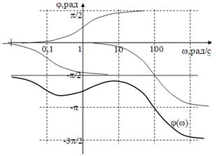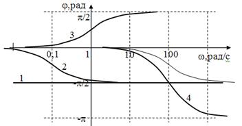 Рис. При построении ЛФХ линейной системы сначала строятся ЛФХ отдельных звеньев, как показано на рис. П9. Цифрами обозначены ЛФХ звеньев: 1 – интегрирующего, 2 – инерционного с Т1 = 10 с, 3 – форсирующего с Т2 = 1 с, 4 – двух инерционных с Т3 = 0,01 с. Сложив эти характеристики, получим ЛФХ системы (рис. 16).