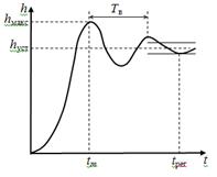 Рис. Обычно используются следующие числовые параметры переходной характеристики: время достижения первого максимума tm, время регулирования tрег, период колебаний на вершине Тв, перерегулирование Δhm/hуст.
