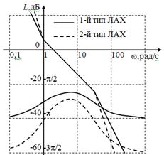 где Т1 = 1/ω1, Т2 = 1/ω2, К = 10L/20, L – значение ЛАХ на частоте ω1. Запас устойчивости по фазе зависит как от длины участка с наклоном –20 дБ/дек., так и от соотношения сопрягающих частот ω1 и ω2 и частоты среза ωср, а также от типа ЛАХ. Для соответствующего типа ЛАХ он определяется выражениями: Δφ1 = arctgωсрT1 – arctgωсрТ2, Δφ2 = arctgωсрТ1 – 2arctgωсрТ2, (4) Δφ3 = -900 + 2arctgωсрТ1 – arctgωсрТ2, Δφ4 = -900 + 2arctgωсрТ1 – 2arctgωсрТ2. Сравним запасы устойчивости по фазе для первого и четвертого типов ЛАХ при одинаковой длительности участка с наклоном –20 дБ/дек., равном 1,5 декады (см. рис. 5). ЛФХ, соответствующая ЛАХ первого типа, получается сложением ЛФХ двух интегрирующих звеньев, форсирующего звена с постоянной времени Т1 и инерционного звена с постоянной времени Т2. ЛФХ, соответствующая ЛАХ четвертого типа, получается сложением ЛФХ трех интегрирующих звеньев, двух форсирующих и двух инерционных звеньев.