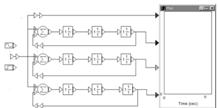 Рис. Видим, что с увеличением наклонов участков ЛАХ, сопрягаемых с участком с наклоном –20 дБ/дек., запас устойчивости по фазе становится меньше. Заметим также, что запас устойчивости по фазе уменьшается с приближением wср к w1 или w2. Для удобства сравнения процессов в системах, отличающихся друг от друга или передаточными функциями, или параметрами исследование проводится одновременно на трех моделях. Эти модели в изображении VisSim приведены на рис. 6.