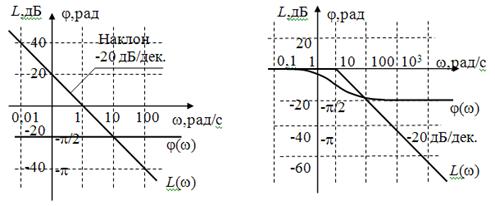 Рис. 4. По этой прямой проводится асимптотическая ЛАХ от нулевых частот до сопрягающей частоты wс1 = 10 рад/с. Это сопрягающая частота инерционного звена с передаточной функцией 1/(1 + 10р), следовательно, наклон ЛАХ изменится на –20 дБ/дек и станет равным: –20 + + (-20) = -40 дБ/дек. (рис. 12).