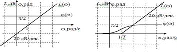 ЛФХ инерционного звена приведена на рис. 8. Фазовый сдвиг на сопрягающей частоте равен -p/4 и изменяется от 0 до -p/2 практически за две декады: по одной в обе стороны от сопрягающей частоты. Логарифмические частотные характеристики дифференцирующего и форсирующего звеньев отличаются от характеристик интегрирующего и инерционного звеньев знаком. Они приведены на рис. 9 и рис. 10 соответственно.