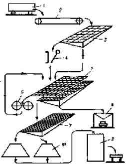 установлены ротор 2, отбойная плита 4, поворотная 5 и выдвижная колосниковая решетки 6. Ротор состоит из одного или нескольких дисков, закрепленных на общем приводном валу. Дробление материала осуществляется под действием удара по нему молотков 3 массой 15...20 кг, шарнирно закрепленных к дискам вращающегося ротора, и соударения кусков с плитами и колосниковыми решетками. Положение колосниковых решеток и отбойной плиты — регулируемое. Рабочий зазор между внутренней поверхностью колосниковой решетки и ротором выбирают в зависимости от крупности продукта дробления. При крупном дроблении обычно он в полтора — два раза больше поперечника максимальных кусков продукта дробления, а при мелком — в три — пять раз. Размер наибольшего куска материала, загружаемого в молотковые дробилки,— 75...600 мм при окружной скорости молотков 60 м/с. При вращении ротора молотки под действием центробежных сил занимают направление по линии, соединяющей ось вращения ротора с осью вращения молотка. При ударе молотки поворачиваются вокруг своей оси в направлении, противоположном вращению ротора. Шарнирное крепление молотков у молотковых дробилок существенно отличает их от роторных с жестко закрепленными билами. Недостатком молотковых дробилок является быстрый износ молотков и колосниковых решеток. Они также не могут быть рекомендованы для измельчения слишком вязких (глинистых) влажных материалов, которые забивают колосниковую решетку Машины для сортировки каменных материаловПроцесс разделения массы или смеси зерен природного происхождения на классы по крупности называется грохочением или сортировкой. Грохочение осуществляют механическим, гидравлическим, воздушным и магнитным способами. Наиболее распространен механический способ, при котором дробленую массу разделяют путем просеивания на грохотах. Основной частью грохота является просеивающая поверхность. Она выполняется в виде сита из плетеной или сварной сетки, а также решета, штампованного из листовой стали, или литого из резины. Сита и решета должны быть износостойкими, сохранять в процессе работы неизменным размер отверстий, иметь большую площадь отверстий. Различают грохочение предварительное, промежуточное, товарное (окончательное). Предварительное грохочение применяют для грубой сортировки на крупные и мелкие куски перед дробилками первичного дробления. При промежуточном грохочении из дробленого материала отделяются более крупные куски для направления в дробилки последующих стадий дробления. При окончательном грохочении материал разделяют на фракции в соответствии с требованиями стандарта. Разделение материала по крупности на фракции осуществляется в результате придания поверхности грохочения определенных по частоте и амплитуде колебаний, обеспечивающих эффективное встряхивание материала и прохождение зерен через просеивающие поверхности. На грохотах можно устанавливать до трех сит. Сита располагают в одной плоскости (грохочение от мелкого к крупному) или ярусами (грохочение от крупного к мелкому). При грохочении от мелкого к крупному (рис. 9) грохот имеет конструкцию простую,
