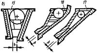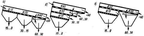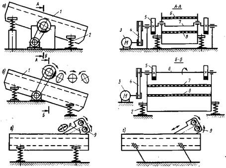 Инерционные виброгрохоты. Они делятся на инерционные наклонные (угол наклона сит 10...25°) и инерционные горизонтальные. Инерционный наклонный виброгрохот (рис. 10, б) имеет приводной механизм, представляющий собой вал 6 с дебалансами 5, опертый на два подшипника, корпуса которых укреплены в стенках короба 1. Короб с ситами 7 и 8 опирается на основание через упругие связи 2. Форма колебаний зависит от расположения неуравновешенных масс и способа подвески короба. Они могут быть круговыми, эллиптическими или прямолинейными (грохоты с пластинчатыми рессорами). Наиболее эффективны грохоты на пружинных опорах. Регулирование амплитуды колебаний достигается сменными дебалансами. В отличие от эксцентриковых в инерционных грохотах с увеличением нагрузки амплитуда колебания короба уменьшается автоматически, защищая конструкцию от перегрузок. Такие грохоты применяют для тяжелых условий работы при товарном грохочении, а также для предварительного грохочения крупнокусковых материалов перед первичным дроблением (вместо сит устанавливают колосниковые решетки в один ярус). Размеры просеивающей поверхности сит 1750х1450 мм, частота вращения вала вибратора порядка 800 мин-1, амплитуда колебаний 3,7...4,5 мм. Эффективное сортирование достигается с вибраторами направленного действия (рис. 10, в, г). Инерционный горизонтальный виброгрохот имеет вибровозбудитель прямолинейно направленных колебаний 9, смонтированный на коробе с ситами. Возбудитель состоит из двух параллельно расположенных дебалансных валов, синхронно вращающихся в разных направлениях. Возмущающая сила такого вибратора направлена по прямой, перпендикулярной линии, соединяющей центры дебалансных валов, и изменяется по закону синуса. Угол действия между возмущающей силой и плоскостью сит составляет 35...45°. Короб с ситами опирается на основание через вертикальные пружины. Размеры просеивающей поверхности сит таких грохотов 1250x3000 мм, частота колебаний 500... 700 в минуту, амплитуда колебаний 8... 12 мм, мощность приводного двигателя 5,5 кВт. Горизонтальные виброгрохоты с направленными колебаниями обеспечивают большую удельную производительность и лучшее качество грохочения по сравнению с наклонными. Техническая