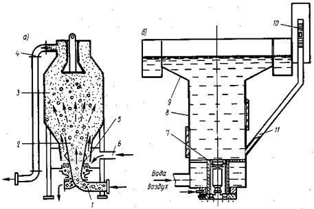 учитывающий содержание в нижнем классе зерен меньше При приближенных расчетах можно определять производительность грохота как производительность желоба с определенной пропускной способностью Пт=3600bhsRp, где b — ширина сита, м; h — толщина слоя сортируемого материала, м (принимается равной размеру поступающих на сито кусков); s = 0,05...0,25 м/с — скорость движения материала вдоль желоба; Rp = 0,4...0,5 — коэффициент разрыхления материала. Машины для мойки каменных материалов Заполнители бетона промывают для удаления глинистых и органических примесей и пыли. Для этого используют различные способы. Если крупность заполнителя не превышает 70 мм, а загрязненность мала и примеси легко отделимы, то промывку совмещают с сортировкой. На грохот по трубам из сопл подается вода под давлением 0,2...0,3 МПа. Расход воды 1,5... 5 м3 на 1 м3 промываемого материала. Материалы крупностью 300...350 мм промывают в цилиндрических гравиемойках-сортировках, состоящих из наклонного барабанного вращающегося грохота с дополнительной моющей секцией с глухой (без отверстий) поверхностью. Вода на промывку подается вместе с материалом. Расход воды до 2 м3 на 1 м3 промываемого материала. Для сильно загрязненного гравия и щебня, содержащих глинистые включения, применяют моечные барабаны с лопастями, закрепленными на внутренней поверхности барабана. Вода подается навстречу движению материала. Диаметры барабанов — 1,5..2,0 м при длине до 4,0 м, производительность установок — до 100 м3/ч. Для мойки песка, отделения от него частиц менее 0,15 мм и последующего обезвоживания применяют гидромеханические и гидравлические классификаторы. Гидромеханический классификатор представляет собой короб, внутри которого размещена спираль. При вращении спирали взвешенные в воде мелкие частицы отводятся в нижнюю часть короба, а крупные направляются спиралью к верхнему разгрузочному окну. Короб устанавливают под углом 16...18°. Диаметр спирали 1000...1500 мм при частоте вращения 8...14 мин-1. Производительность классификатора — до 200 т/ч. Гидравлические классификаторы (рис. 11, а) применяют для промывки и
