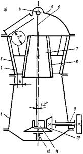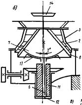 В каждый момент одна из образующих дробящего конуса оказывается наиболее приближенной к внутренней поверхности неподвижного конуса, а противоположная ей образующая — наиболее удаленной. Таким образом, в любой момент поверхности дробящих конусов, сближаясь, производят дробление материала, а в зоне удаления этих поверхностей ранее раздробленный материал под действием собственной массы разгружается через кольцеобразную выпускную щель. Процесс дробления в конусных дробилках, в отличие от щековых, происходит непрерывно при последовательном перемещении зоны дробления по окружности конусов, что способствует более равномерной нагрузке механизма и двигателя дробилки. Размер наибольших кусков, которые могут быть загружены в дробилку, определяется радиальной шириной загрузочного отверстия. Характеристика крупности дробления и производительность дробилки зависят от радиальной ширины разгрузочного отверстия. Различают конусные дробилки для крупного, среднего и мелкого дробления. Они отличаются между собой способом установки и углами конусности дробящих конусов. В конусных дробилках для крупного дробления (рис. 5, а) измельчение материала производится в кольцевом рабочем пространстве, образованном двумя конусами: неподвижным 2 и подвижным — дробящим 7. Первый закреплен к основанию дробилки 1. Дробящий конус плотно насажен на вал 6, верхний конец которого шарнирно с помощью подвесного подшипника 4 крепится к траверсе 5, а нижний — свободно входит в стакан-эксцентрик 11. Последний может вращаться в вертикальном подшипнике 12 станины дробилки. Вращение стакану-эксцентрику передается от электродвигателя через горизонтальный вал 9 и коническую передачу-10. Дробящие конусы бронированы плитами 3 и 8 из износостойкой стали. Геометрические оси подвижного и неподвижного конусов образуют угол до 2...30. При вращении эксцентрикового стакана геометрическая ось подвижного конуса описывает коническую поверхность с вершиной в точке подвеса вала, а сам конус совершает круговые качания внутри неподвижного. Дробление материала происходит в зоне, где поверхности конусов сближаются, а разгрузка – там, где эти поверхности расходятся. Максимальная крупность кусков, загруженных в дробилку при В = 900, 1200 и 1500 мм, составляет соответственно 750, 1000 и 1200 мм, а ширина разгрузочной щели — 125...225 мм. Конусные дробилки для среднего и мелкого дробления (рис. 5, б) значительно отличаются от дробилок для крупного дробления прежде всего очертанием профиля рабочего пространства. Подвижный дробящий конус 7 имеет угол при вершине 80...100° «пологий конус», у дробилок крупного дробления этот угол составляет 20...30° («крутой конус»). Неподвижный дробящий конус 3 также расширяется книзу, образуя с подвижным «параллельную зону» (рис. 5, в), при движении по которой материал подвергается неоднократному сжатию и дроблению до размера, равного выходной щели. Поэтому крупность продукта дробления определяется шириной закрытой, а не открытой, как у дробилок крупного дробления, разгрузочной щели. Камеры дробления этих дробилок принимают меньшие по размеру куски и выдают более мелкий продукт. Наибольший размер загружаемого куска в дробилки среднего дробления 60...300 мм при размере разгрузочного отверстия 12...60 мм; у дробилок мелкого дробления соответственно 8...170 мм при размере разг