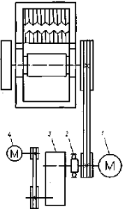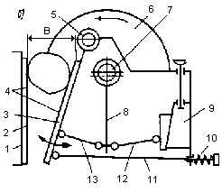 из сварного корпуса 1, в котором в подшипниках установлен эксцентриковый вал 7 с подвешенным к нему шатуном 8. Нижний конец шатуна имеет специальные гнезда, в которых свободно вставлены концы распорных плит 12 и 13. Противоположный конец распорной плиты 13 вставлен в гнездо подвижной щеки 3, подвешенной на оси 5. Конец плиты 12 упирается в клиновой упор регулировочного устройства 9. Тяга 11 и пружина 10 обеспечивают обратное движение подвижной щеки и удерживают от выпадения распорные плиты. К неподвижной 2 и подвижной щекам крепятся дробящие плиты 4 с вертикальным рифлением, являющиеся основными рабочими органами щековых дробилок. Рабочие поверхности дробящих плит и боковые стенки корпуса дробилки образуют камеру дробления. Дробящие плиты устанавливают так, чтобы выступы одной располагались против впадин другой (рис. 2, в). Привод дробилки состоит из электродвигателя и многорядной клиноременной передачи с массивным шкивом-мховиком 6. Для обеспечения пуска дробилок, а также пуска дробилок под завалом в последних конструкциях дробилок применен вспомогательный привод (рис 3).