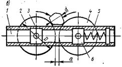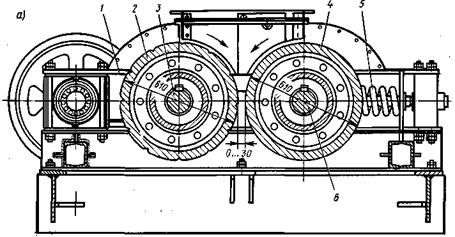 являются два параллельных цилиндрических валка 2 и 4, вращающиеся навстречу один другому. Попадающий в рабочую зону кусок материала увлекается трением о поверхность валков и затягивается в рабочее пространство, где подвергается дроблению в результате раскалывания, излома и истирания. Поверхности валков изготовляют гладкими и рифлеными. Валки монтируются на станине 1 в подшипниках 3 и 6. Подшипники одного либо двух валков имеют пружинные опоры 5, которые могут перемещаться в направляющих при попадании в дробилку не дробимого предмета. Вращение валка сообщается от электродвигателя через клиноременную передачу с частотой 75...190 мин-1. Наибольший