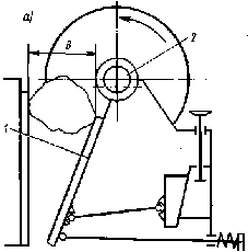 по конструкции проще, чем с простым качанием, и имеет меньшую массу. В ней отсутствует шатун, а подвижная щека 1 подвешена непосредственно к эксцентриковому валу 2, в результате чего точки подвижной щеки движутся по эллиптическим траекториям с минимальной разностью осей эллипса вверху и максимальной внизу. Дробление материала происходит в результате раздавливания, раскалывания, излома и истирания материала. Дробилки со сложным качанием щеки применяют для среднего и мелкого дробления пород средней крепости. Сложное движение подвижной щеки приводит к более интенсивному износу дробящих плит и более частой их замене. Недостатками щековых дробилок являются цикличный характер их работы и высокая энергоемкость процесса разрушения. Удельная мощность [кВт/(м3/ч)] при минимальной ширине разгрузочной щели достигает у дробилок с простым качанием 1,2...4,6 и со сложным качанием щеки — 0,9...4,6. Типоразмер щековой дробилки определяется размером ширины В и длины L загрузочного зева дробилки. Величина В характеризует максимальную крупность кусков, загружаемых в дробилку (Dmax = 0,85 В), а величина L определяет в основном ее производительность. Отечественные щековые дробилки выпускаются следующих типоразмеров: 400х600; 600х900; 900х1200; 1200х1500; 1500х2100; 2100х2500 мм, производительностью до 800 м3/ч. Техническая