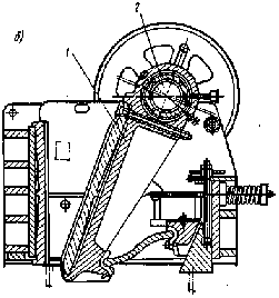 При одностадийном дроблении получаемые мелкие зерна заполняют промежутки между крупными и защищают их от непосредственного воздействия дробящих органов машины, что сопровождается дополнительным измельчением материала и расходом энергии. Основными показателями работы дробилок являются: максимальная крупность дробления, степень измельчения, удельный расход энергии (кВт · ч/м3), производительность (м3/ч или т/ч). Щековые дробилки. Их применяют для крупного и среднего дробления прочных и средней прочности пород на первичной и вторичной стадии дробления. По характеру движения подвижной щеки щековые дробилки разделяют на дробилки с простым и сложным качанием щеки. Дробилка с простым качанием щеки (рис. 2, а, б) состоит: