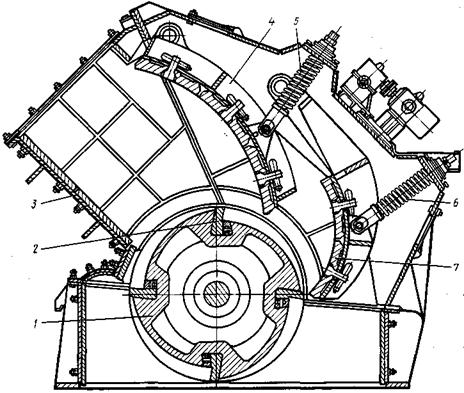 Вращение ротору сообщается от электродвигателя через клиноременную передачу. Внутри корпуса подвешены отражательные плиты 4 и 7, нижняя часть которых опирается на пружинно-регулировочное устройство 5 и 6, позволяющее регулировать ширину выходной щели, а также пропускать не дробимое тело при его попадании в камеру дробления. Дробление материала осуществляется в результате удара по нему бил и удара кусков об отражательные плиты, чем достигается высокая (10...20) степень дробления. В сравнении с другими типами дробилок роторные дробилки имеют меньшую металлоемкость, небольшие габариты, что в сочетании с высокой степенью дробления обусловило применение их в передвижных дробильных установках. Размер наибольшего куска, загружаемого в дробилки крупного дробления, 800...1000 мм, среднего — 400...600 мм при окружной скорости 20...35 м/с. Для дробления пород средней прочности, а также мягких материалов, таких, как шлак, гипс, мел, глины, применяют молотковые дробилки. Молотковая дробилка (рис. 8) состоит из сварного корпуса 1, в котором