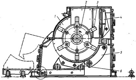 характеризуют диаметром и длиной валков. Производительность валковых дробилок (М3/Ч) Роторные и молотковые дробилки. Роторные дробилки применяют для дробления известняка, доломита, руд, мрамора и других подобных им материалов, обладающих малой абразивностью. Их выпускают двух типов: для крупного дробления, которые используют на первичной стадии дробления; для среднего и мелкого дробления, используемые на заключительных стадиях дробления. Работа таких дробилок основана на принципе разрушения пород ударными нагрузками. Роторные дробилки обеспечивают получение щебня высокого качества, преимущественно кубообразной формы, с одновременным обогащением продукта дробления, так как более слабые составляющие пород подвергаются значительному измельчению и отсеиванию от основных фракций. Роторная дробилка представляет собой коробчатый корпус 3, в котором размещены вращающийся с большой скоростью ротор 1 с жестко закрепленными на его внешней поверхности билами 2 (рис. 7.).