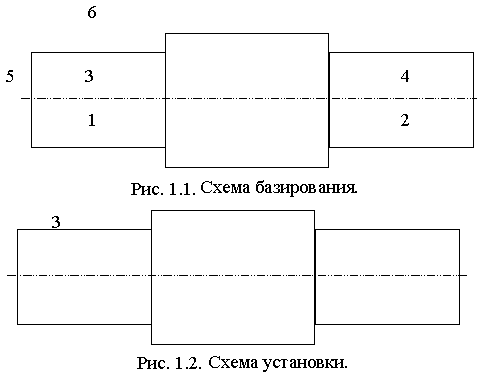 Вывод: деталь вала имеет конструкцию, которую надо признать технологичной, т.к. удовлетворяет 89% требований при отработке конструкции на технологичность. Рассчитаем такт производства: Тпр = Fд / N , где F - годовой фонд времени; N - годовой объем выпуска детали. Тпр = 3945 / 20000 = 0,20 ч/шт. - крупносерийное производство. 1.4. Выбор баз. При обработке вала необходимо провести операции: токарную и фрезерную. Токарная операция проводится за один установ при выборе установки в трехкулачковый самоцентрирующий патрон с использованием жесткого центра.