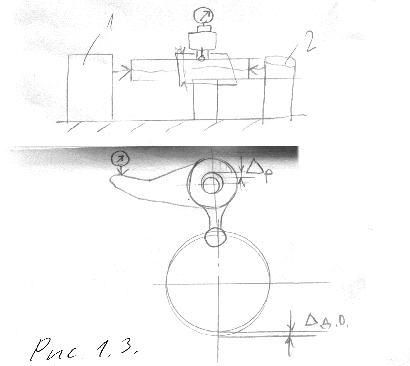 Расчет точности контрольного приспособления. Схема контрольного приспособления для измерения точности зубчатого профиля представлена на рис. 1.3. Погрешность измерения будет зависеть от погрешности (биения) делительной окружности профиля: Dд.о. = 0,009 мм . Также погрешность будет возникать от смещения оси рычага при посадке с зазором в отверстие Æ4Н6: Dр = 0,021 мм. Схема контрольного приспособления.
