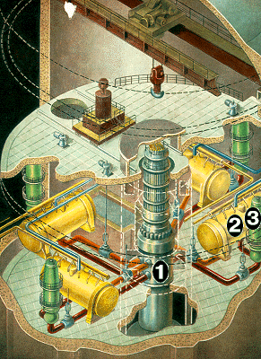Большое влияние на отношение широкой публики к атомной энергетике оказывали аварии на атомных электростанциях, особенно авария на АЭС "Трехмильный остров" /TMI-2/ недалеко от Гаррисбурга /США/, произошедшая 28 марта 1979 года, и авария на 4-ом блоке Чернобыльской АЭС, случившаяся 26 апреля 1986 года. Под влиянием этих аварий в ряде стран поднялась широкая волна общественного сопротивления использованию атомных электростанций, возбуждаемая страхами об опасностях воздействия атомной радиации на окружающую среду и население. Эти аварии породили сомнения в зрелости концепций безопасности, заложенных в основы проектов атомных электростанций, достаточности принимаемых мер безопасности. После этих событий резко возросла интенсивность научных исследований в области обеспечеия безопасности объектов атомной энергетики. Однако большое число исследований проблем безопасности АС, хотя и выявили недостатки, упущения и даже ошибки в мерах обеспечения безопасности АС, лишь подтвердили уверенность специалистов в том, что разумно высокая степень безопасности АС может быть достигнута на основе современных знаний и технологий. С другой стороны, уроки аварий указали на необходимость пересмотра концепции обеспечения безопасности, потребовали повышения свойств самозащищенности реакторов, обеспечения более высокого уровня безопасности за счет использования пассивных средств защиты. Далее, в настоящем курсе будет представлен обзор современного состояния проблем безопасности атомных электростанций и показано, что реально имеется большой запас методов и средств обеспечения безопасности, которые к тому же, не слишком отягощают экономические показатели АС. Так что, несмотря на опасения по поводу радиационных опасностей использования атомной энергии, нет сомнений, что атомная энергетика сможет отвечать самым строгим требованиям безопасности, что будущее энергопроизводства - за атомной энергетикой. 3 Классификация ядерных реакторовЯдерные реакторы делятся на несколько групп: · в зависимости от средней энергии спектра нейтронов - на быстрые, промежуточные и тепловые; · по конструктивным особенностям активной зоны - на корпусные и канальные; · по типу теплоносителя - водяные, тяжеловодные, натриевые; · по типу замедлителя - на водяные, графитовые, тяжеловодные и др. Для энергетических целей, для производства электроэнергии применяются: · водоводяные реакторы с некипящей или кипящей водой под давлением, · уран-графитовые реакторы с кипящей водой или охлаждаемые углекислым газом, · тяжеловодные канальные реакторы и др . В будущем будут широко применяться реакторы на быстрых нейтронах, охлаждаемые жидкими металлами (натрий и др.); в которых принципиально реализуем режим воспроизводства топлива, т.е. создания количества делящихся изотопов плутония Pu-239 превышающего колич ество расходуемых излотопов урана U-235. Параметр, характеризующий воспроизводство топлива называется плутониевым коэффициентом. Он показывает, сколько актов атомов Pu-239 создается при реакциях захвата нейтронов в U-238 на одмин атом уU-235, захва тившег о нейтрон и претерпевшего деление или радиационное превращение вU-2356ю . 3.1 Реакторы с водой под давлением.Реакторы с водой под давлением занимают видное место в мировом парке энергетических реакторов. Кроме того, они широко исп