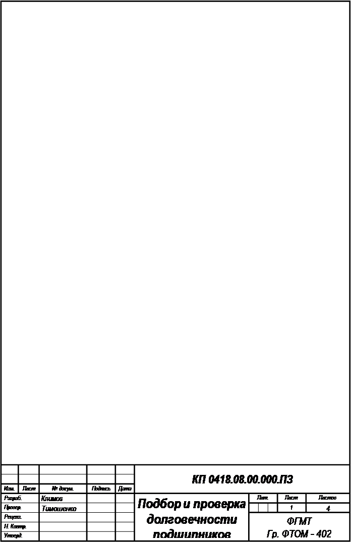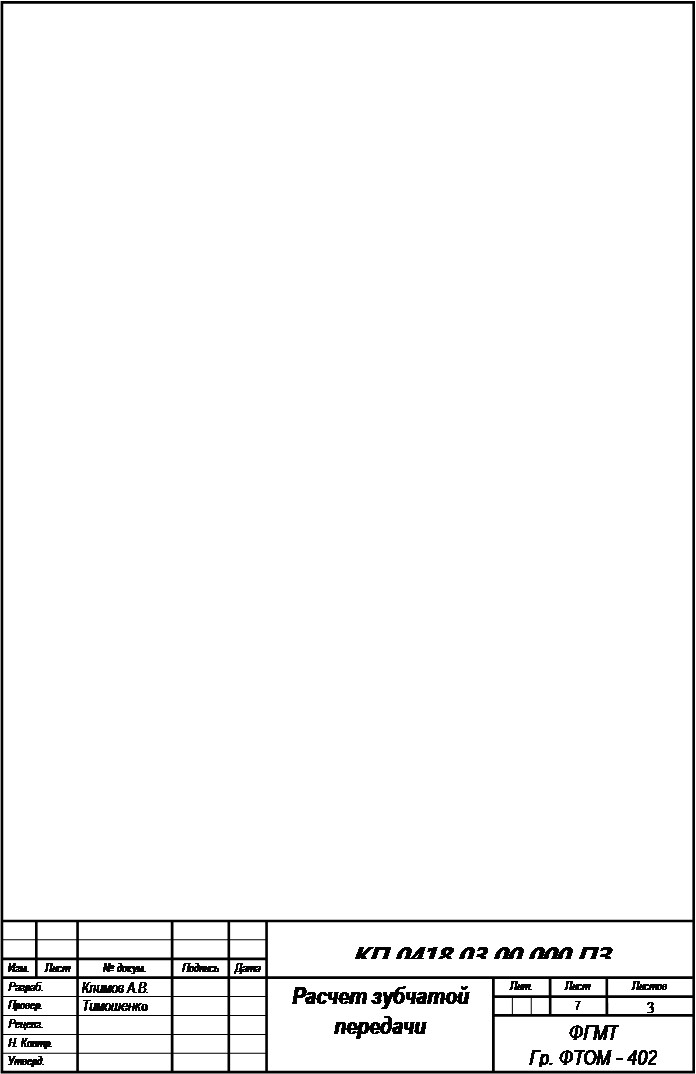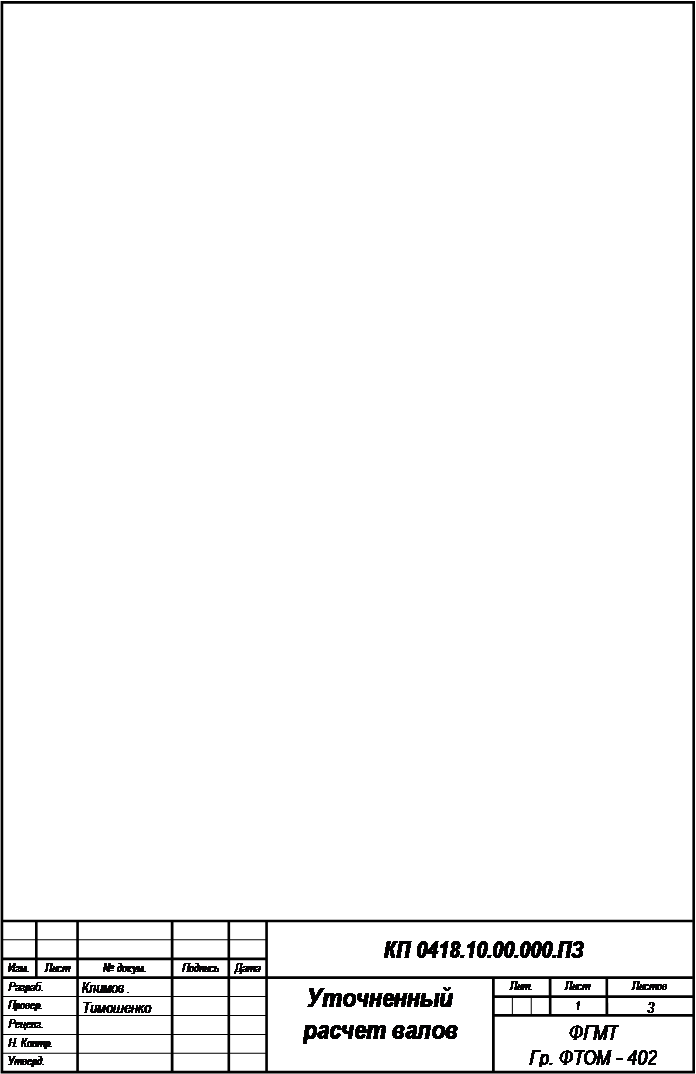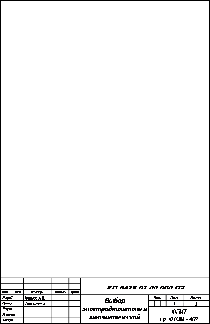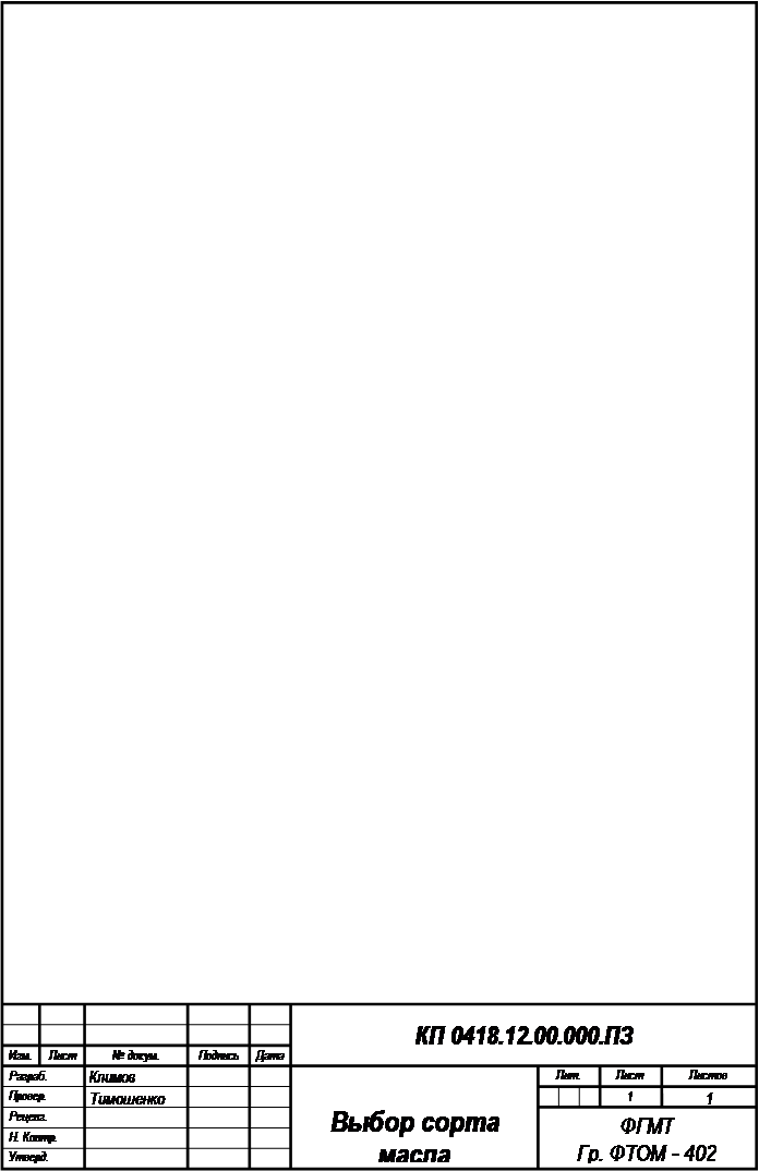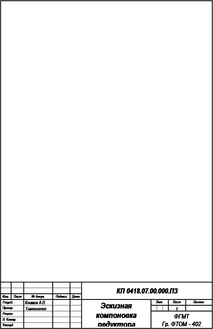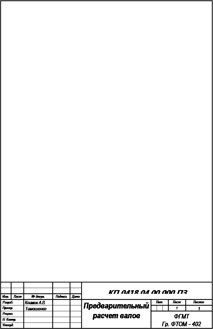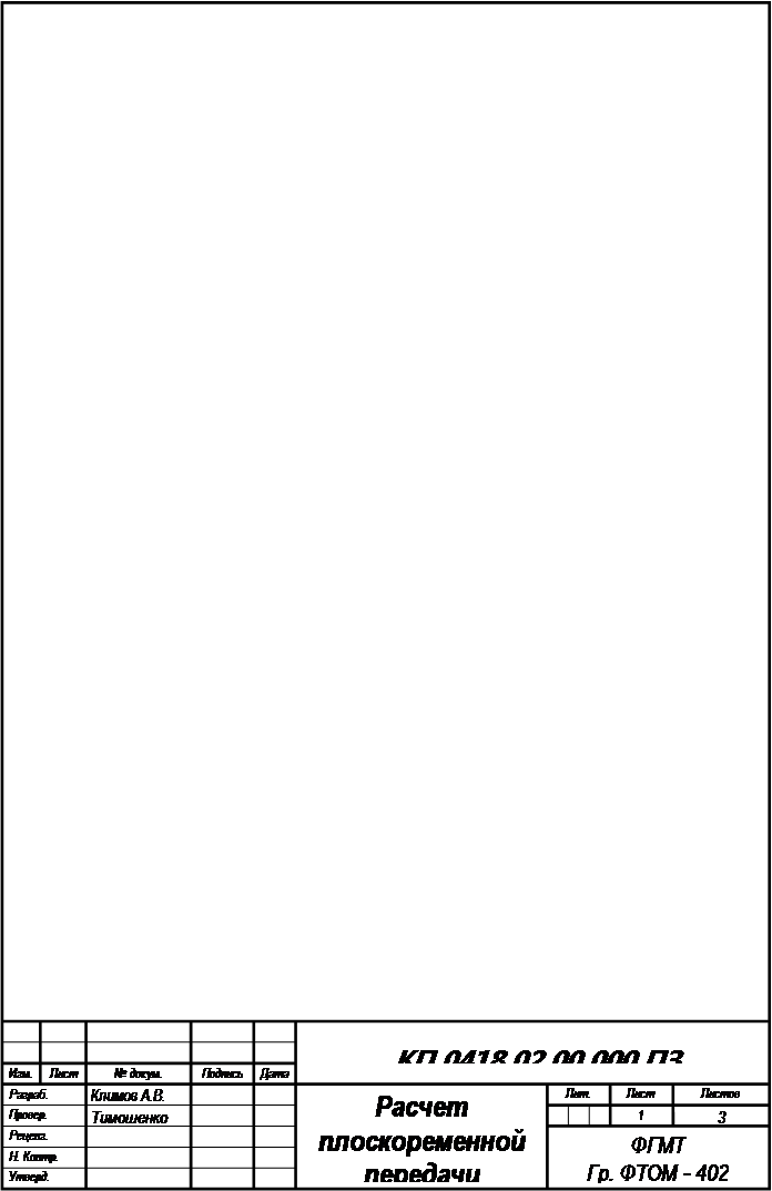Гомельский государственный машиностроительный техникум Специальность ТО 301 Технология оборудования автоматизация машиностроения Группа ФТОМ 402 Курсовой проект по предмету: Техническая механика ”Детали машин” тема: Спроектировать одноступенчатый червячный редуктор с нижним расположением червяка с плоскоременным приводом КП 0418.00.00.000 Разработал А.В. Климов Проверил Т.Л. Тимошенко 2003