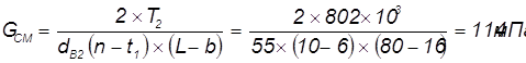 Проведем проверку прочности лишь одного соединения, передающего вращающий момент от вала червячного колеса к шкиву ременной передачи. Диаметр вала в этом месте dВ2 = 55мм Сечение и длинна шпонки t x h x L = 16 x 10 x 80 Глубина паза t1 = 6мм; L = 80мм Момент TK2 = T2 =802 x 10 3Н мм Напряжение смятия