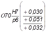 червячного колеса на вал 1. Посадка в системе отверстия, вид посадки с натягом. 2. Номинальный размер D = 70мм. 3. Детали соединения отверстие. Ø70Н7, квалитет 7 вал Ø70 р6, квалитет 6 4. Предельные отклонения ГОСТ25347-82 отверстие ES = +0,03мм = +30мкм EI = 0 вал es = +0.051мм = 51мкм ei = +0,032мм = 32мкм 5. Обозначения на чертежах 6. Предельные размеры (мм) отверстие Dmax = D + ES = 70 + (+0,030) = 70,030 (11.1) Dmin = D + EI = 70 + 0 = 70 (11.2) вал dmax = D + es = 70 + (+0,051) = 70,0,51 (11.3) dmin = D + ei = 70 + (+0,032) = 70,032 (11.4) 7. Допуски мм. Отверстие TD = Dmax – Dmin = 70,030 – 70 = 0,030 (11.5) TD = ES – EI = 0,030 – 0 = 0,030 (11.6) вал Td = dmax - dmin = 70,051 – 70,032 = 0,019 (11.7) Td = es – ei = 0,051 – (+0,032) = 0,019 (11.8) 8. Nmax = dmax – Dmin = 70,051 – 70 = 0,051 (11.9) Nmax = es – EI = 0,051 – 0 = 0,051 (11.10) Nmin = dmin = Dmax = 70,032 – 70,030 = 0,002 (11.11) Nmin = ei – ES = 0,032 – 0,030 = 0,002 (11.12) 9. Допуск посадки (мм) ТП = TD + Td = 0,030 + 0,019 = 0,049 (11.14) ТП = TS = Nmax – Nmin = 0,051 – 0,002 = 0,049 (11.15) 10. Схема поля допуска.