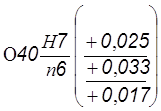 шкива ременной передачи на вал редуктора 1. Посадка в системе отверстия, вид посадки переходная. 2. Номинальный размер D = 40мм. 3. Детали соединения отверстие. Ø40Н7, квалитет 7 вал Ø40 n6, квалитет 6 4. Предельные отклонения ГОСТ25347-82 отверстие ES = +0,025мм = +25мкм EI = 0 вал es = +0.033мм = 33мкм ei = +0,017мм = 17мкм 5. 6. Предельные размеры (мм) отверстие Dmax = D + ES = 40 + (+0,025) = 40,025 (11.16) Dmin = D + EI = 40 + 0 = 40 (11.17) вал dmax = D + es = 40 + (+0,028) = 40,033 (11.18) dmin = D + ei = 40 + (+0,015) = 40,017 (11.19) 7. Допуски мм. Отверстие TD = Dmax – Dmin = 40,025 – 40 = 0,025 (11.20) TD = ES – EI = 0,025 – 0 = 0,025 (11.21) вал Td = dmax - dmin = 40,033 – 40,017 = 0,016 (11.22) Td = es – ei = 0,033 – (+0,017) = 0,016 (11.23) 8. Nmax = dmax – Dmin = 40,033 – 40 = 0,033 (11.24) Nmax = es – EI = 0,033 – 0 = 0,033 (11.25) Nmin = dmin = Dmax = 40,017 – 40,025 = -0,008 (11.26) Nmin = ei – ES = 0,017 – 0,025 = -0,008 (11.27) 9. Допуск посадки (мм) ТП = TD + Td = 0,025 + 0,017 = 0,042 (11.29) ТП = TS = Nmax – Nmin = 0,033 – (-0,008) = 0,042 (11.30) 10. Схема поля допуска.