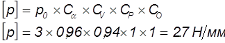 Коэффициент режима работы Ср по таблице (7.5) Для передачи к ленточному конвейеру при постоянной нагрузке Ср = 1.0 Коэффициент учитывающий угол наклона линии центров передачи Со При наклоне до 60 º принимаем Со = 1 Допускаемая рабочая нагрузка на 1 мм. ширины прокладки Н/мм.
