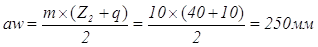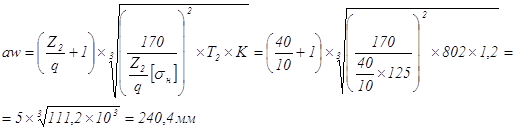 σн] = Число витков червяка Z1 принимаем в зависимости от передаточного числа при U = 10 принимаем Z1 = 4 Число зубьев червячного колеса Z2 = Z1 x U = 4 x 10 = 40 (3.1) Принимаем предварительно коэффициент диаметра червяка q = 10; Коэффициент нагрузки К = 1,2; Межосевое расстояние aw = 250 мм; m = 10мм; Определяем Межосевое расстояние исходя из условия контактной прочности.