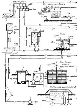 Рис.1 Высотная схема водоочистного комплекса 1 — подача промывной воды от фильтров; 2 — песколовка; 3 — гидроэлеватор; 4 — резервуар-усреднитель промывной воды; 5 — насос перекачки промывной воды; б — возврат промывной воды на очистную станцию; 7 — подача осадка от осветлителей; 8 — резервуар приема осадка: 9 — установка медленного перемешивания осадка; 10 — площадка обезвоживания осадка; 11 — колодец для напуска осадка; 12 — насос перекачки сгущенного осадка; 13 — емкость сгущенного осадка; 14 — осадкоуплотнитель; 15 — насосы перекачки сырого осадка; 16 — подача исходной воды; 17 — башня промывной воды; 18 — вихревой смеситель; 19 осветлитель со взвешенным осадком; 20 — скорый фильтр; 21 — резервуар чистой воды; 22 — насос II подъема; 23 — насос подкачки промывной воды; 24 — бочки с хлором; 25 — испаритель; 26 — хлораторы первичного хлорирования; 27 — то же, вторичного; 28 — растворно-храннлищный бак коагулянта; 29 — насос перекачки раствора коагулянта; 30 — расходный бак коагулянта, 31 — насос-дозатор раствора коагулянта; 32 — мешалка полиакриламида; 33 — насос для циркуляции и подачи полиакриламида в расходный бак; 34 — расходный бак раствора полиакриламида; 35 —. насос-дозатор раствора ПА
