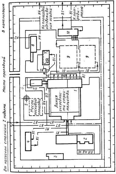 Рис.2. Генеральный план водоочистного комплекса 1 — блок основных сооружений; 2 — реагентное хозяйство; 3 — котельная: 4- служебный корпус; 5 — башня промывной воды; 6 — хлораторная; 7 — сооружения оборота промывной воды; 8 — сооружения обработки, осадка; 9 — резервуар чистой воды; 10 — насосная станция II подъема На крупных водоочистных комплексах предусматривают песковое хозяйство для хранения, сортировки, промывки и транспортирования материалов, необходимых для периодической догрузки и перегрузки фильтровальных аппаратов. Определение объема емкостей для хранения фильтрующих материалов и подбор оборудования для их промывки и рассева производят из расчета 10% ежегодного пополнения фильтрующей загрузки и дополнительного аварийного запаса на перегрузку одного фильтра при их общем количестве до двадцати. Загрузку фильтрующим материалом следует производить с помощью Песковых или водоструйных насосов при скорости движения пульпы 1,2... 2 м/с. Для надежной организации работы водоочистного комплекса в его составе необходимо предусматривать лаборатории, мастерские и другие вспомогательные помещения согласно СНиПу. Диспетчерский пункт цеха водоочистки обычно устраивают совмещенным с пунктом управления насосными станциями I и II подъема. Принципы компоновки водоочистных комплексов Основополагающими при решении генплана водоочистного комплекса помимо географических, топографических и геологических условий являются его производительность и состав водоочистных сооружений. На генплане показывают блок основных водоочистных сооружений, служебный корпус, реагентное хозяйство, башню промывной воды, сооружения обработки осадка, НС II подъема, хлораторную со складом хлора, резервуары чистой воды, котельную, место песковой площадки (рис. 18.2). Компактное взаимное расположение отдельных водоочистных сооружений, вспомогательных помещений и оборудования на генплане комплекса должно предусматривать минимальные капиталовложения в строительство, обеспечивать максимальные удобства и экономичность эксплуатации, минимальную протяженность трубопроводов и дорожных покрытий между ними, удобство производства ремонтных работ, надежность и бесперебойность работы комплекса, возможность планомерного расширения при росте водопотребления. На рациональное решение генерального плана водоочистного комплекса доминирующее влияние оказывает рельеф местности. Так, в целях уменьшения объема земляных работ по выемке грунта и обсыпке отдельных сооружений рекомендуется располагать в повышенных местах сооружения с высокими отметками заложения фундамента, а с малыми — в пониженных. Все основные и вспомогательные сооружения желательно располагать в виде единого комплекса (рис. 18.3), образуемого трех-, двух-, и одноэтажными зданиями. Для малых водопроводов компактность расположения водоочистных сооружений и оборудования достигается их размещением на одном участке, а иногда и в одном здании с насосными станциями I и II подъема. Однако, подобные решения не должны быть в ущерб удобств эксплуатации, монтажа оборудования и планового расширения. При компоновке сооружений большой производительности (более 100 тыс. м3/сут) предусматривают отдельные здания для реагентного хозяйства входных устройств, сооружений предварительной обработки воды и филь