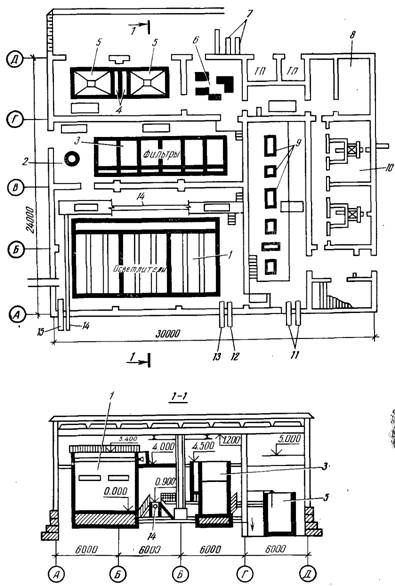 Рис. 18.3. Компоновка водоочистных сооружений. 1 — осветлители со взвешенным осадком; 2 — смеситель; 3 — скорые фильтры; 4 — расходные баки коагулянта; 5 — растворные баки-хранилища коагулянта; 6 — насосы-дозаторы и воздуходувки; 7 — подача чистой воды потребителю; 8 — мастерские; 9 — насосная станция II подъема; М — бытовые помещения; 11 — всасывающие трубопроводы из резервуаров чистой воды; 12 —• отвод чистой воды в резервуаре; 13 — сброс осадка из осветлителей; 14 — сброс промывной воды от фильтров; 15 — подача исходной воды При решении генплана водоочистного комплекса необходимо предусматривать возможность его расширения на расчетный период. С этой целью на генплане предусматривают площадку, обозначаемую пунктиром, при этом трассировка трубопроводов первой очереди должна непременно учитывать последующее расширение. Стороны здания, в направлении которых будет производиться пристройка при расширении комплекса, не должны загромождаться постройками постоянного типа, подземными сооружениями и коммуникациями. Каналы и трубы обвязки сооружений должны быть рассчитаны с запасом на возможность пропуска воды после реконструкции отдельных водоочистных сооружений или целых блоков. При проектировании генерального плана водоочистного комплекса необходимо предусматривать минимальную протяженность путей перемещения реагентов; максимально возможную механизацию погрузочно-разгрузочных работ и смены загрузки фильтровальных аппаратов; маневренность эксплуатации как отдельных технологических сооружений, так и целых блоков. Планировка территории комплекса должна обеспечивать отвод атмосферных осадков от всех технологических сооружений, отдельных; зданий и с площадки последних. На территории комплекса помимо дорог предусматривают устройство тротуаров и озеленение. При решении компоновки блока основных сооружений преследуют цель логической последовательности передачи воды от сооружения к сооружению при минимальной протяженности коммуникации, учитывая возможность интенсификации работы отдельных сооружений или расширения комплекса. Использование технологии обработки воды в осветлителях со слоем взвешенного осадка на водоочистных комплексах производительностью до 50 тыс. м3/сут позволяет разместить в одном здании все основные технологические сооружения, реагентное хозяйство, входные устройства (вариант) и НС II подъема. При этом смесители, осветлители и фильтры выделены в отдельный зал. При большей производительности водоочистного комплекса служебные помещения выносятся в двухэтажное отдельное здание, входные устройства стыкуют с основными сооружениями или размещают в отдельно стоящем здании реагентного хозяйства. В этом случае в состав реагентного цеха включают отделения коагулирования, флокулирования, фторирования и могут быть еще отделения углевания, известкования и др. Для удобства эксплуатации служебный корпус и реагентный цех проходными галереями соединяются с блоком основных сооружений. При решении компоновки водоочистных комплексов по одноступенчатой схеме с контактными осветлителями при производительности до 50 тыс. м3/сут входные устройства (микрофильтры, контактные камеры) размещают в отдельном здании, а реагентное хозяйство стыкуют с основными сооружениями, либо входные устройства сочетают 